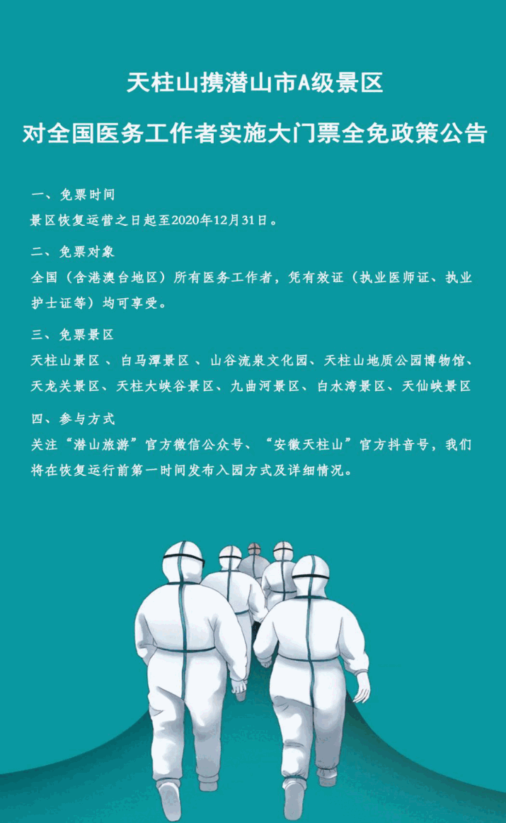 天柱山攜潛山市A級景區(qū)對全國醫(yī)務工作者實施大門票全免政策公告