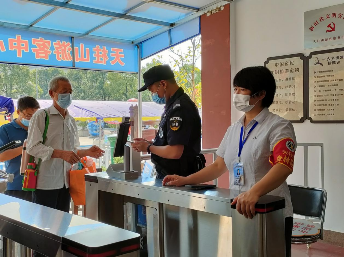 秋日明媚,天空湛藍,天柱山景區(qū)彩旗飄飄,游客絡繹不絕,歡聲笑語中更顯節(jié)日濃厚的喜慶氛圍?!白鹁吹挠慰?#xff0c;請佩戴好口罩,保持一米間距”“請到這邊來掃安康碼”身穿紅馬甲,頭戴小紅帽的天柱山旅游志愿者的語音在游客中心廣場上此起彼伏。