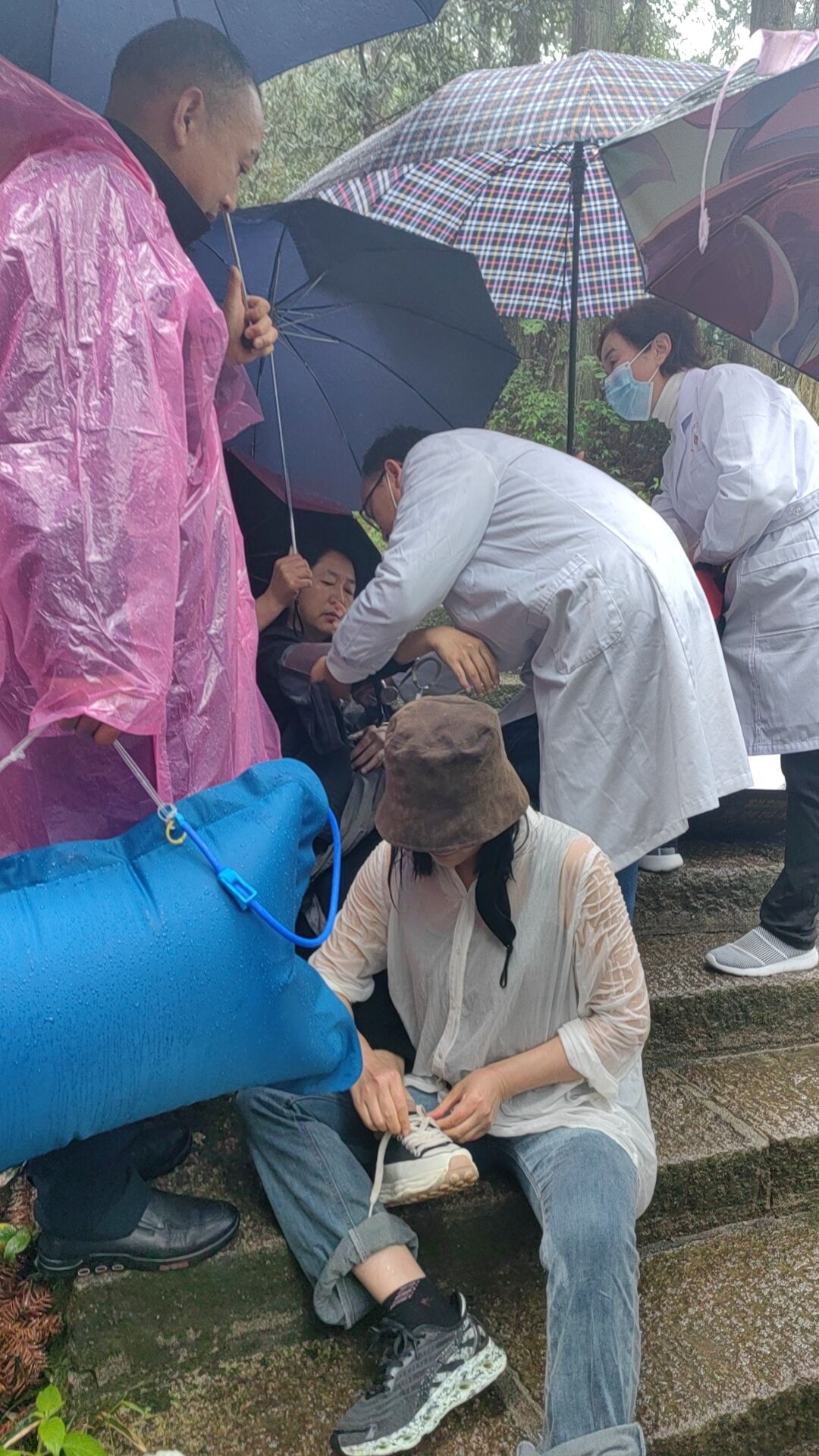 此時(shí)此刻,一場(chǎng)與時(shí)間賽跑的急速救援的暖心一幕,在天柱山景區(qū)真實(shí)上演。到達(dá)救援現(xiàn)場(chǎng),游客高女士呈現(xiàn)心慌、四肢無力、全身發(fā)抖、不能言語、時(shí)有惡心等狀態(tài),醫(yī)生給游客認(rèn)真仔細(xì)地做了檢查,表示情況十分危急,需及時(shí)到山下醫(yī)院就診。劉星第一時(shí)間撥通120急救電話,隊(duì)員汪小曲冒雨把高女士從迎真峰背負(fù)至牧羊河索道上站,路程約四五百米,然后坐索道下山并將游客抬上救護(hù)車,送往潛山市中醫(yī)院就診,稍微歇停背負(fù)的汪小曲,已累得癱軟一旁,站立不穩(wěn)。